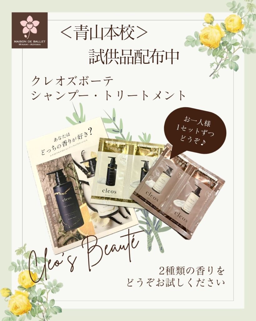 メゾン恒例の試供品配布のお知らせです♪ 今回は<青山本校>にて、クレオパトラからインスピレーションを受けた ビューティーブランド「クレオズボーテ」の エクストラモイストシャンプー&リペアトリートメントの試供品をお配りしております✨ 2種類の香りがセットになっており、比較していただけます。 紺色 高級ホテルのような深みのある「エキゾチックウッディの香り」 白色 山田優さんコラボレーションの上品で華やかな「ミスティックウッディの香り」 ベビーシャンプーと同等の低刺激処方です。 【 クレオズボーテのすごいところ❢ 】 ★97%が水と美容液でできている「洗える美容液」 ★濃密な泡が摩擦を徹底ガード ★ドライヤーの熱に反応して髪をコーティング ★美しい髪の条件であるハリ・コシ・ツヤを叶えます♪ |
