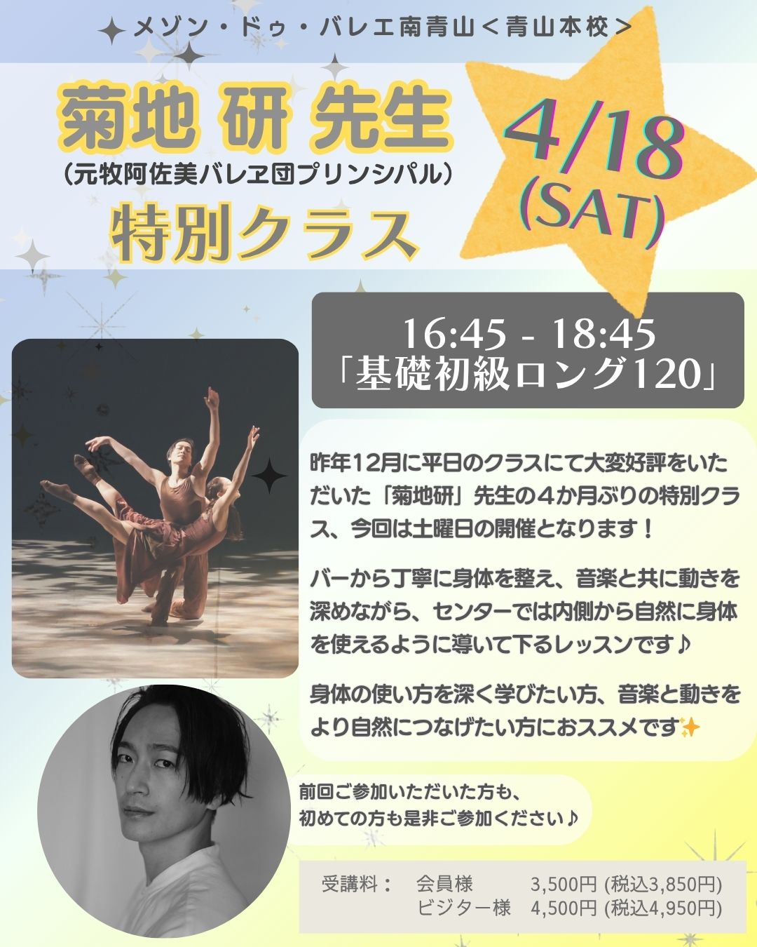 * バーレッスンを含みませんので、一つ前の初級クラス(16:45-18:15)(担当講師:保坂アントン慶 先生)をお受けいただくようお勧めしますが、お受けにならない場合はご自身で責任を持ってウォームアップしてください。